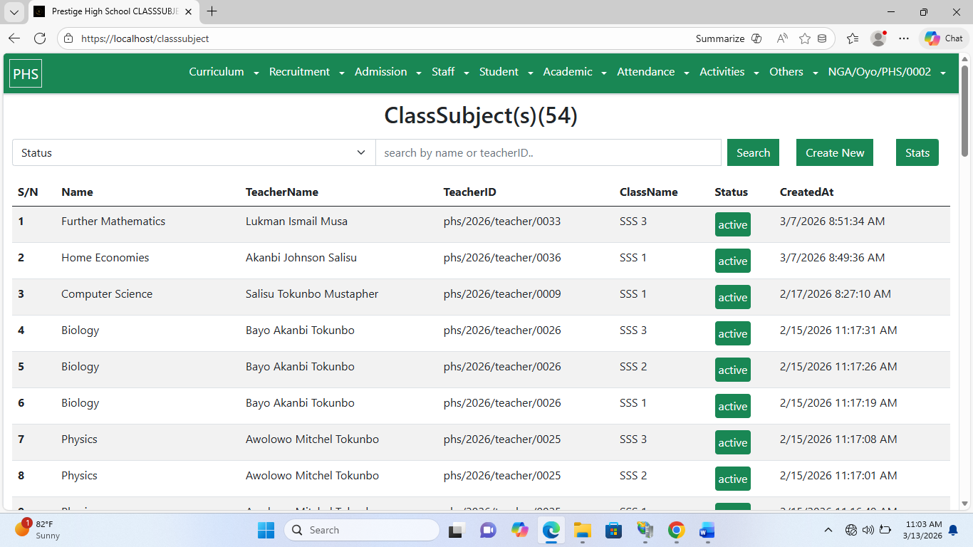 ClassSubject management organizes and assigns academic subjects to classes and teachers. SPA automatically ensures subjects align with the curriculum.
