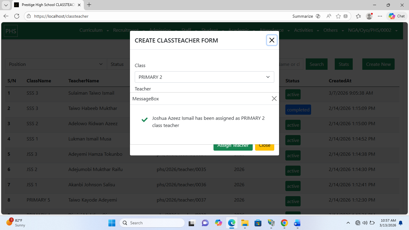 Note: Each class can have only one ClassTeacher per academic year.